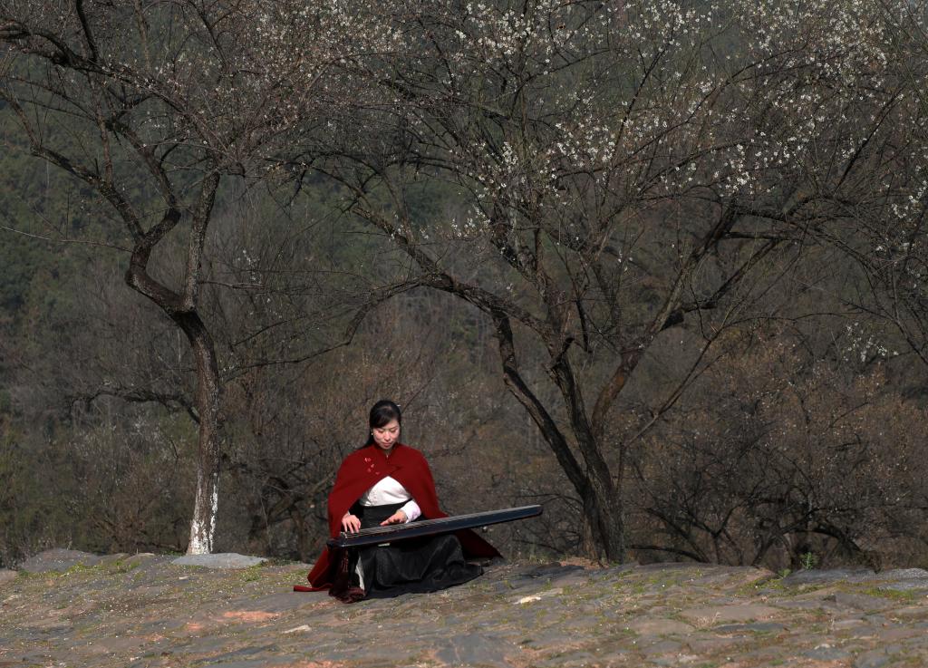 记者看到,飘落的梅瓣下,三两游客身着传统服饰,或撑伞而立,或席地抚琴,美不胜收。从广州自驾而来的吴女士在一片红梅前流连忘返,“早就盼着来赏梅花!踏上古道,除了赏景,还可沉浸在千百年来的历史风韵中,仿佛在跟古人对话。”