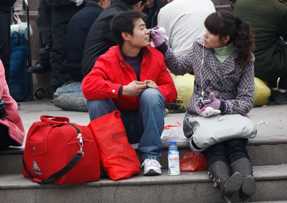 2010年1月30日,将返乡过年的河南商丘人袁冠军(左)在上海火车站站前广场候车时与女友一起分享音乐。新华社记者裴鑫摄