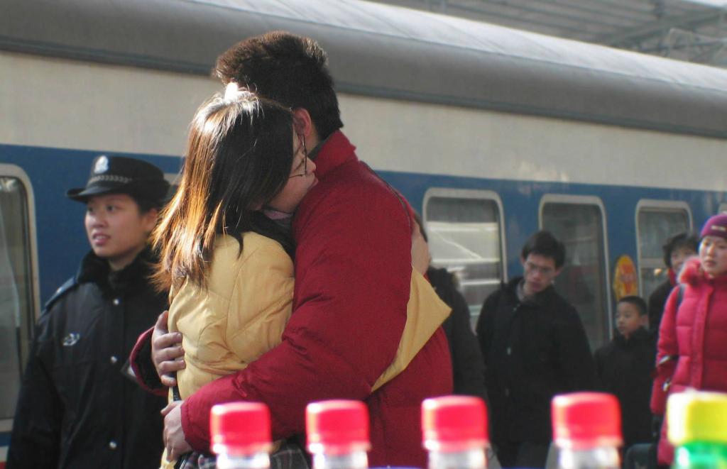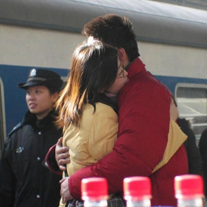 2005年1月25日,一对情侣在济南火车站站台恋恋不舍地拥别。新华社记者徐速绘摄
