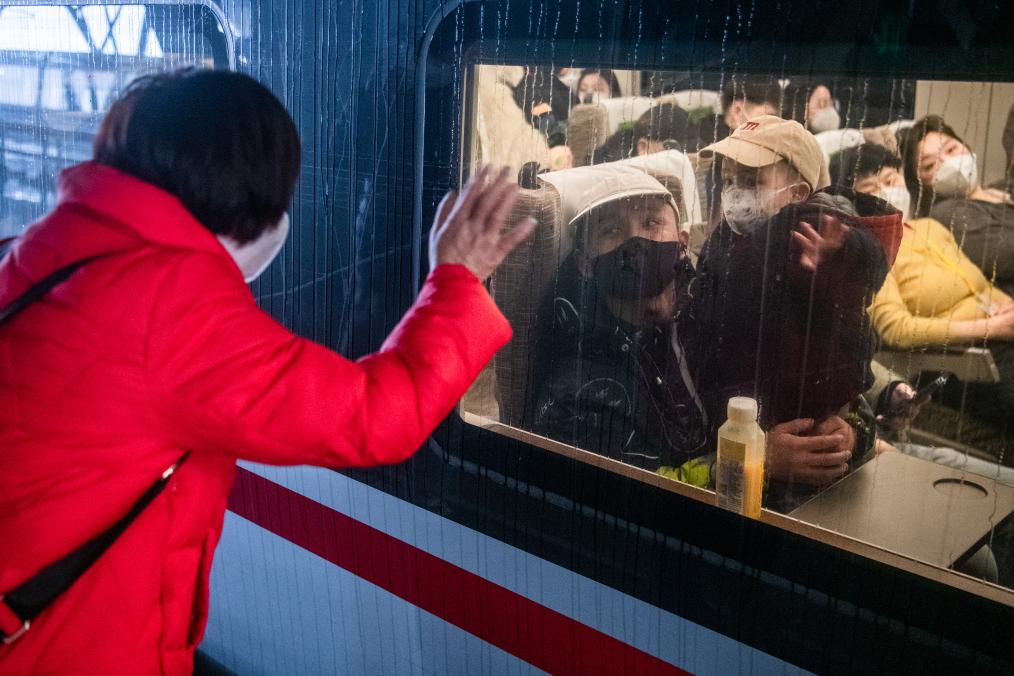 2023年1月7日,在武汉站站台,旅客与亲人告别。新华社记者伍志尊摄