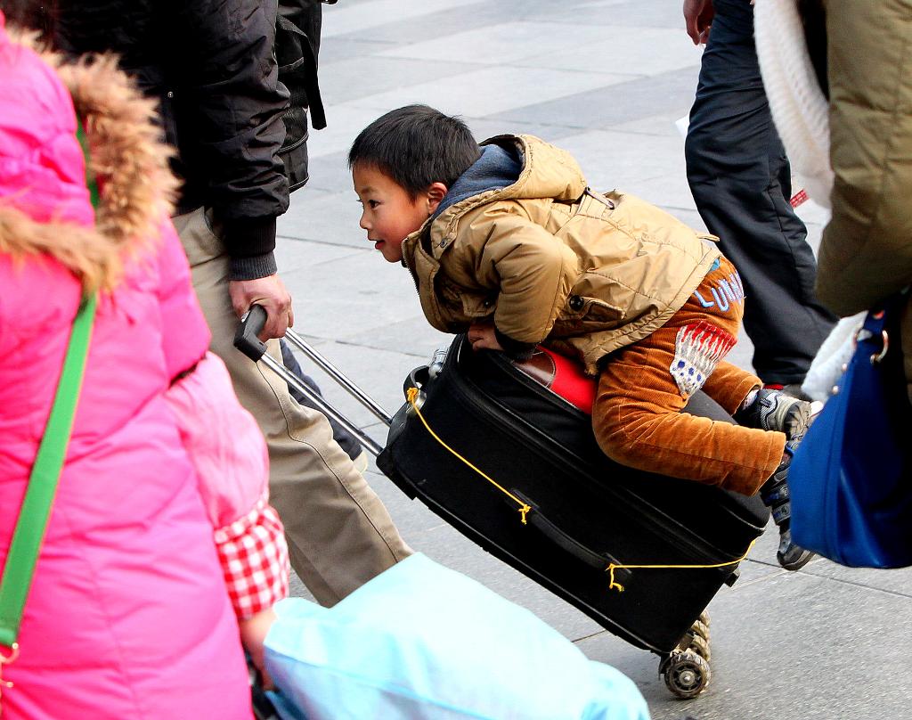 2013年1月25日,一名小男孩趴在父亲的拉杆箱上进入上海火车站候车。新华社记者陈飞摄