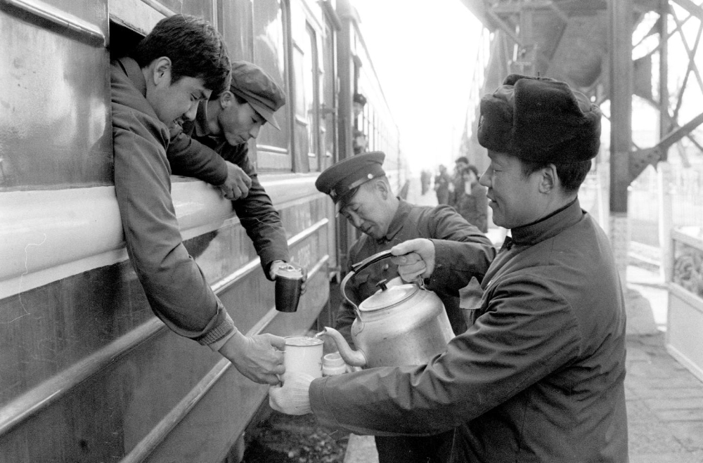 1984年春运期间,在石家庄火车站,工作人员为过往旅客送开水。新华社记者赵连升摄