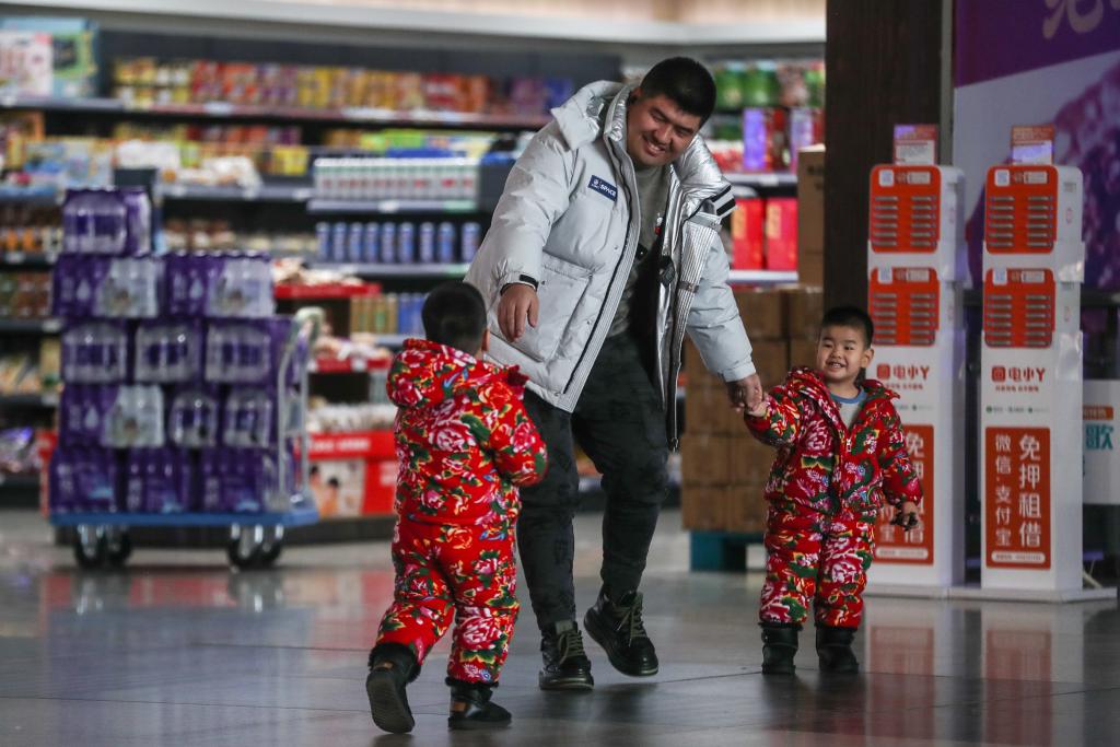 2024年1月26日,在内蒙古工作的李振南带着两个儿子在沈阳站中转,准备回黑龙江佳木斯市过年。新华社记者潘昱龙摄