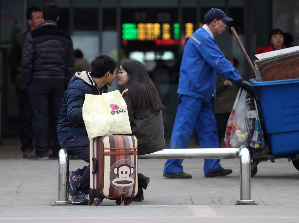 2015年2月7日,在长沙火车站,两名年轻人坐在隔离栏上等候进站乘车。新华社记者李尕摄