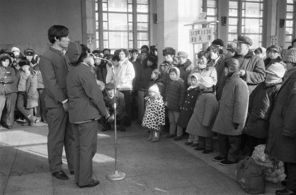 1984年2月1日,在北京火车站候车室,车站职工业余文艺演出队为旅客们演出文艺节目。 新华社发(马洪中摄)