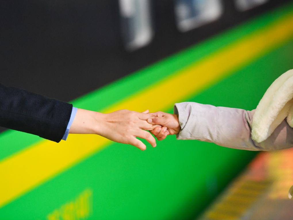 2020年1月3日,南昌客运段列车值班员卞菁和女儿在南昌西站站台上离别。新华社记者胡晨欢摄