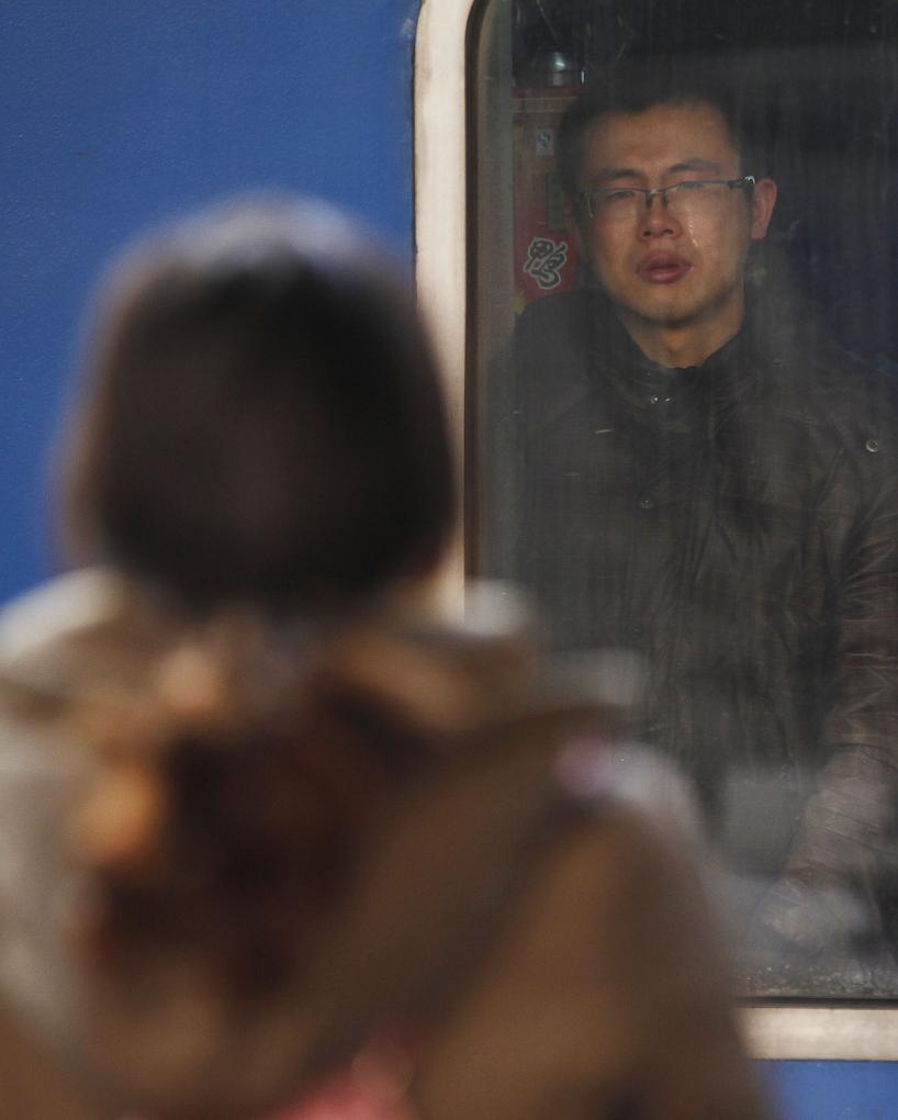 2013年1月26日,在北京站始发的北京至哈尔滨的第一趟临客列车即将开车前,一对恋人隔着车窗依依不舍。新华社记者王申摄