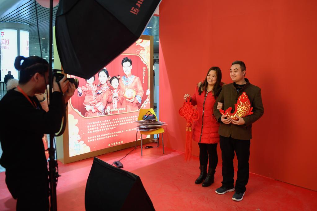 2019年1月21日,一对夫妻在杭州火车东站接受“幸福照相馆”的免费合影服务。 新华社记者黄宗治摄