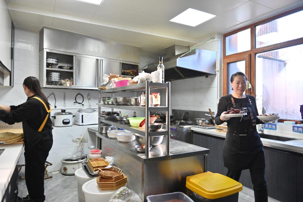 潘娜(右)在她的“知归晓苑”民宿厨房为客人端出早餐。新华社记者宋为伟 摄