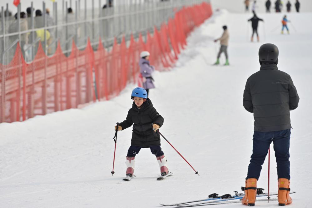 游客在位于罗庄子镇的蓟州溶洞景区冰雪世界体验滑雪。新华社记者宋为伟 摄