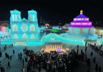将冰雕建筑“天坛”和“巴黎圣母院”相连