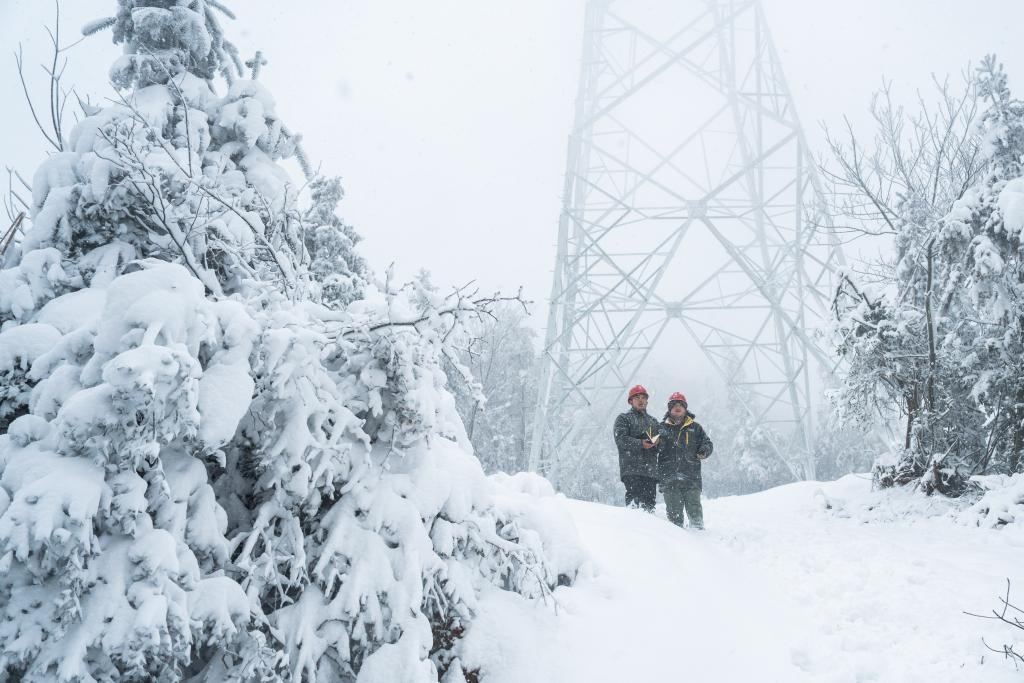 1月22日,国网长沙供电公司输电检修人员在浏阳市蕉溪镇蕉溪岭巡查电力设施覆冰情况。新华社记者 陈思汗 摄