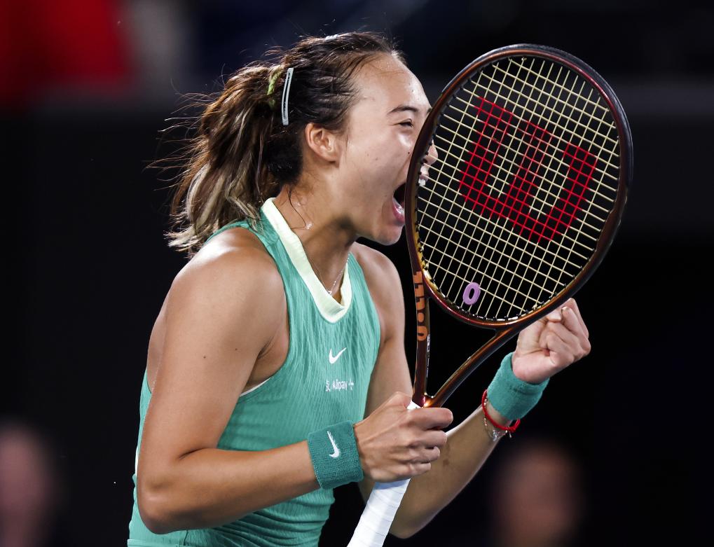 1月25日,郑钦文庆祝晋级决赛。新华社记者 马平 摄