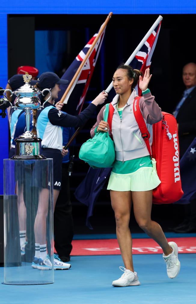 1月27日,2024澳网女单决赛前,郑钦文进场时向观众挥手致意。新华社记者 马平 摄