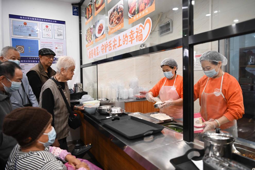 在广州市越秀区洪桥街道三眼井社区长者饭堂,工作人员在给前来用餐的老年人打饭(2024年1月17日摄)。新华社记者 邓华 摄