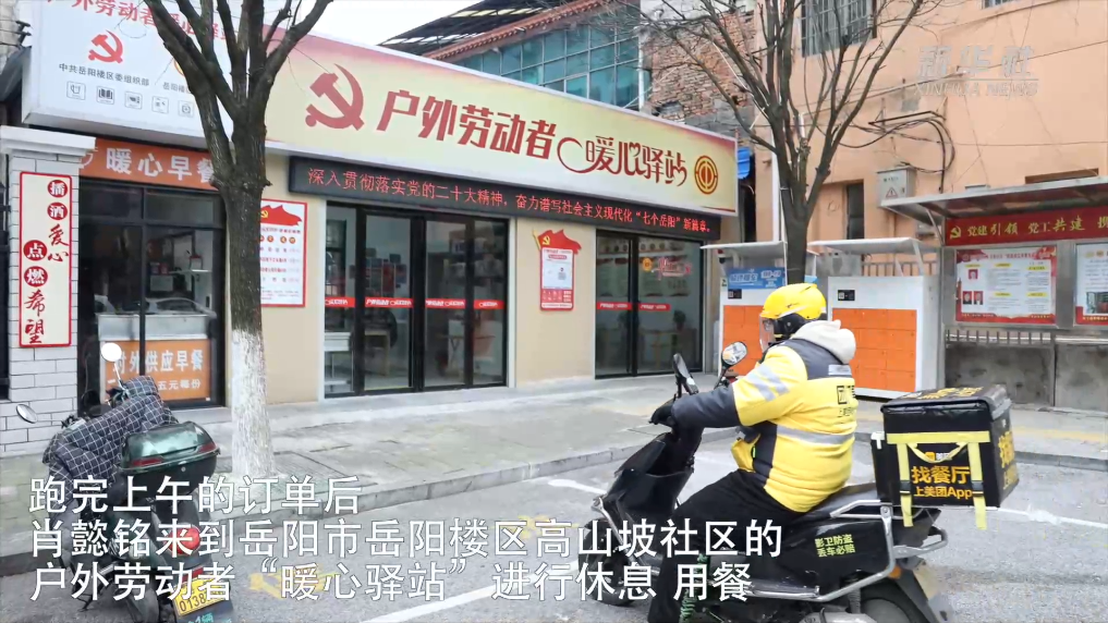 在岳阳,19岁的海南人肖懿铭送完外卖订单后,能够在舒适的“暖心驿站”休息、用餐。