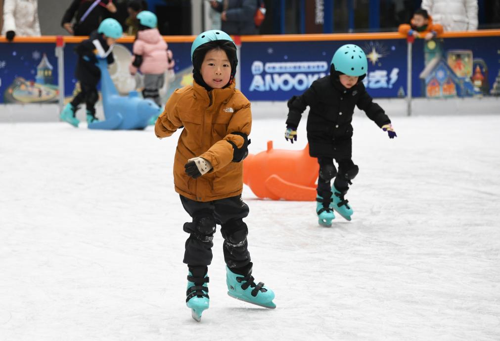 2024年1月13日,小朋友在中粮·祥云小镇第九届冰雪季活动中体验滑冰。新华社记者 任超 摄