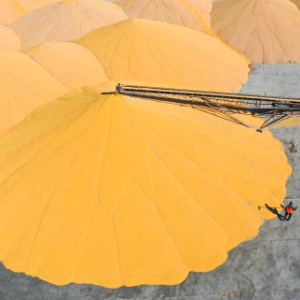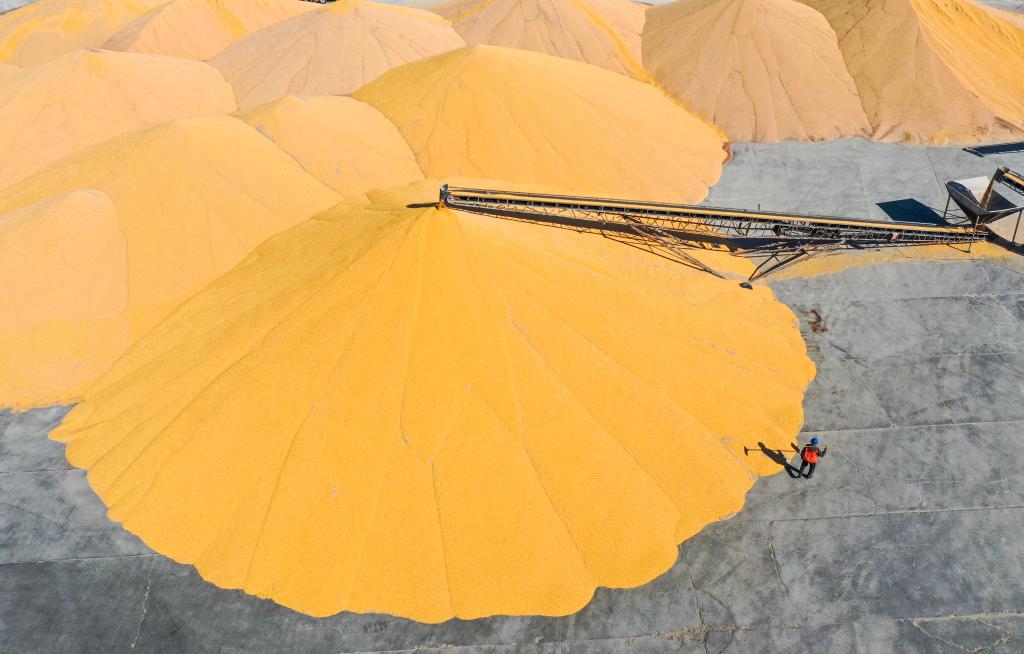 2023年10月15日,通辽市科尔沁左翼中旗腰林毛都镇收粮站的工人在整理烘干的玉米堆(无人机照片)。新华社记者 连振 摄