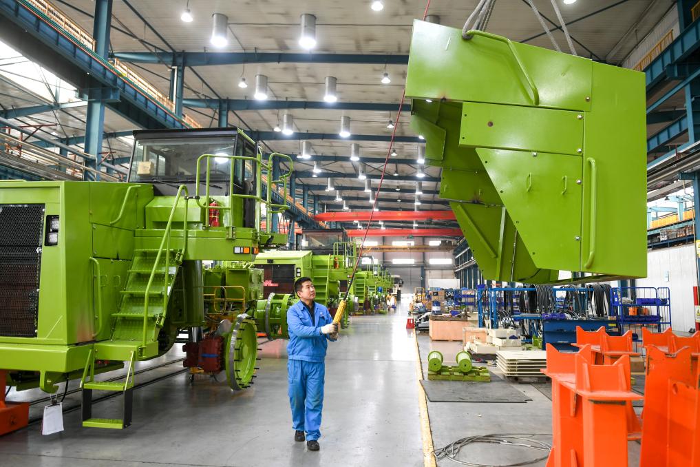 图为工人在内蒙古北方重型汽车股份有限公司生产车间吊装散热器护罩。新华社记者贝赫 摄
