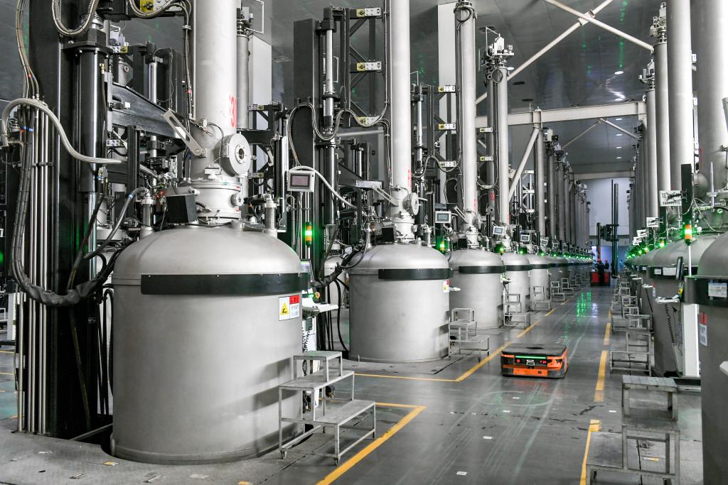 图为包头一家晶硅光伏材料生产企业的单晶硅棒生产车间。新华社记者贝赫 摄