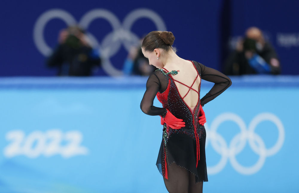 2022年2月17日,俄罗斯奥委会选手卡米拉·瓦利耶娃在北京2022年冬奥会花样滑冰女子单人滑自由滑比赛后退场。新华社记者 曹灿 摄