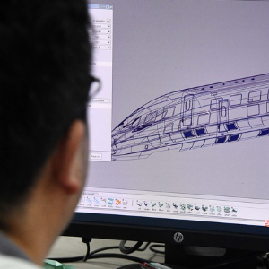 2023年8月29日,中车青岛四方设计部门工作人员在进行车辆框架设计。新华社记者 李紫恒摄