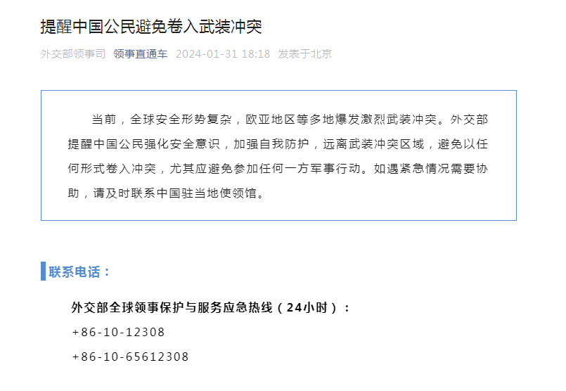 据外交部“领事直通车”微信公众号1月31日消息,当前,全球安全形势复杂,欧亚地区等多地爆发激烈武装冲突,外交部提醒中国公民强化安全意识,加强自我防护,远离武装冲突区域,避免以任何形式卷入冲突,尤其应避免参加任何一方军事行动。如遇紧急情况需要协助,请及时联系中国驻当地使领馆。