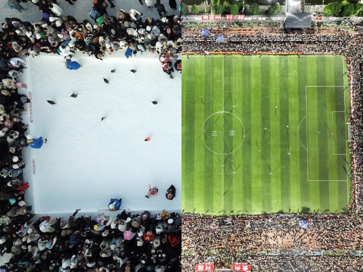 拼版照片:左图是游客在哈尔滨极地公园广场观看企鹅巡游(新华社记者 王建威 摄);右图是夜幕下的“村超”总决赛现场(新华社记者 欧东衢 摄)