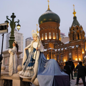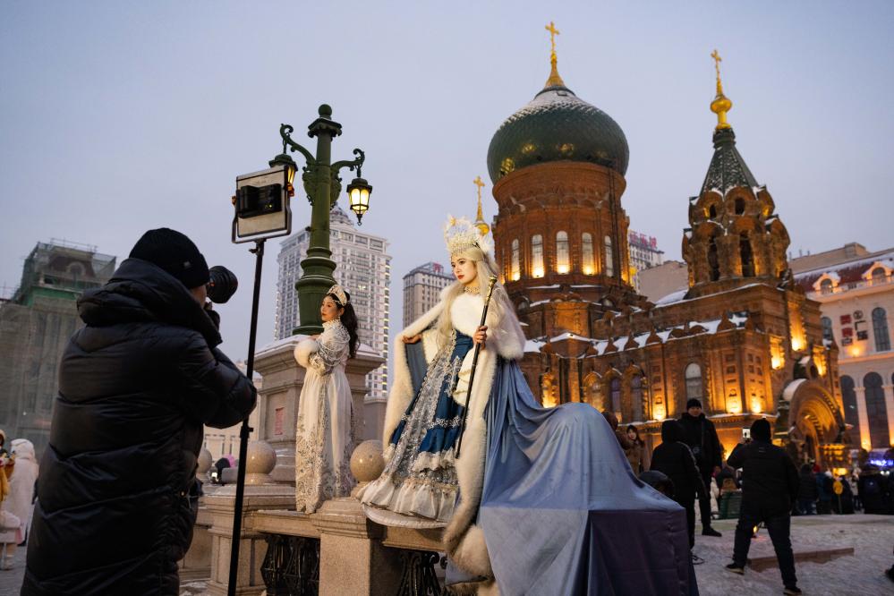 1月12日,游客在哈尔滨建筑艺术广场盛装拍摄写真。新华社记者 谢剑飞 摄