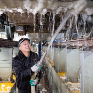 在山东青岛北动车所,机械师刘伟民用温水清除列车下的积冰:“动车组运行在山区或气温较低的区段,未融化的积雪及雨水会附着在动车组走行部导致结冰。我和同事会根据需要增加排班,保障列车安全。”