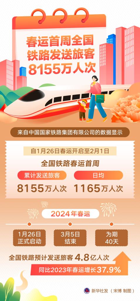新华社北京2月2日电(樊曦、唐嘉雨)2日,2024年春运度过首周。来自中国国家铁路集团有限公司的数据显示,自1月26日春运开启至2月1日,全国铁路春运首周累计发送旅客8155万人次,日均1165万人次。