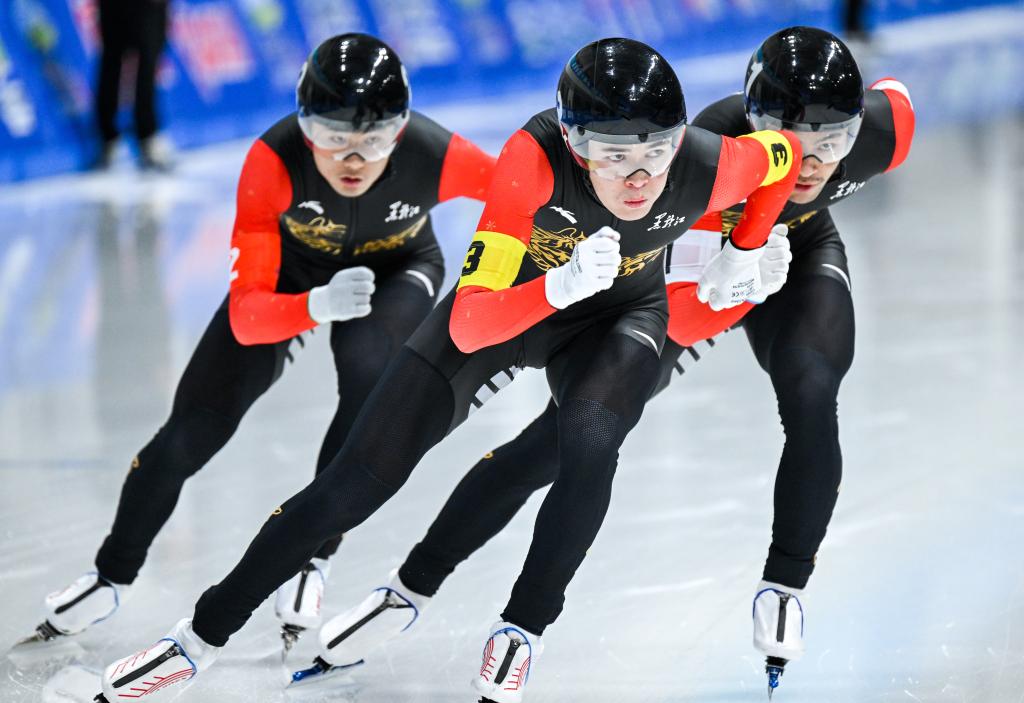 1月14日,选手在第十四届全国冬季运动会速度滑冰公开组男子团体追逐决赛中比拼。新华社记者 连振 摄
