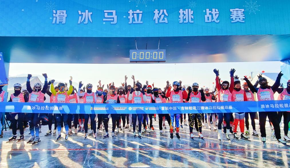 1月30日,参赛者在吉林省滑冰马拉松挑战赛起点处等候出发。新华社记者 颜麟蕴 摄