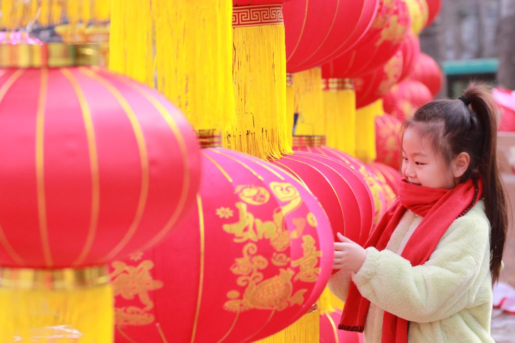 1月30日,小朋友在山东潍坊高密市年货大集上挑选红灯笼。新华社发(李海涛 摄)