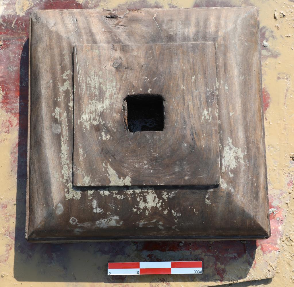 在亭山遗址南区,考古工作者则发现了建于人工台地上的大型建筑基址。目前已经揭露了一片东西长56米、南北宽10.5米的区域。从建筑基址遗迹上看,古人先挖基槽埋下地梁,再在地梁上立柱,并在基槽两端开挖柱坑。地梁立柱的柱网结构为面阔30间、进深7间。柱坑里的方形木柱础边长50厘米至80厘米不等,上面还有漆绘,相当豪华考究。徐新民说,从已经揭露的区域看,该建筑当属高等级的礼制性公共建筑。