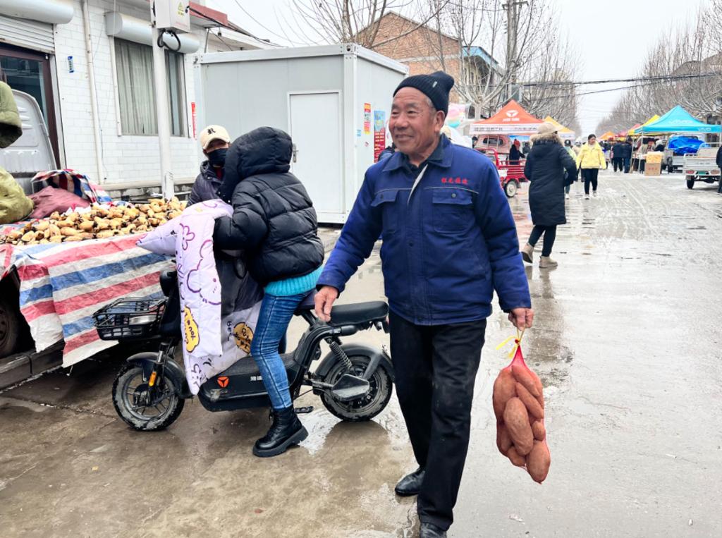 “这红薯好,甜!”今年73岁的李永恩高兴地拎着一大袋红薯正往小三轮车上放。“快过年了,来集上凑热闹!这个集上的菜很新鲜,买了好几样。”虽然年纪大了,走起路来有些蹒跚,但他精神头儿十足,红薯、莲菜、胡萝卜……他兴奋地向记者展示着车上满满当当的年货。