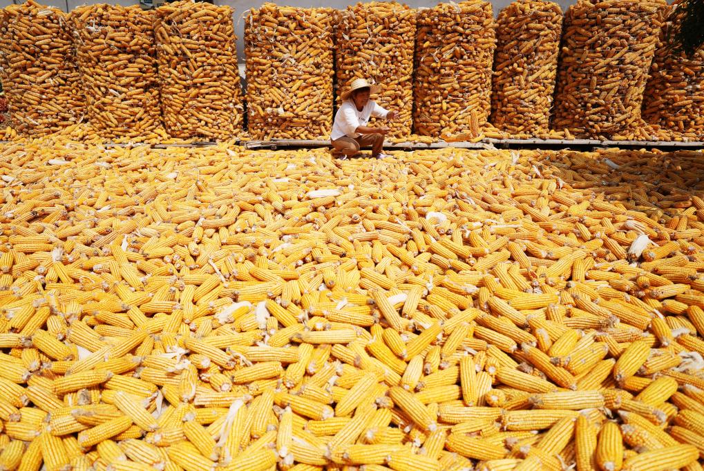 ↑2023年9月18日,山东省临沂市郯城县郯城街道三井村村民整理晾晒收获的玉米。新华社发(张春雷摄)