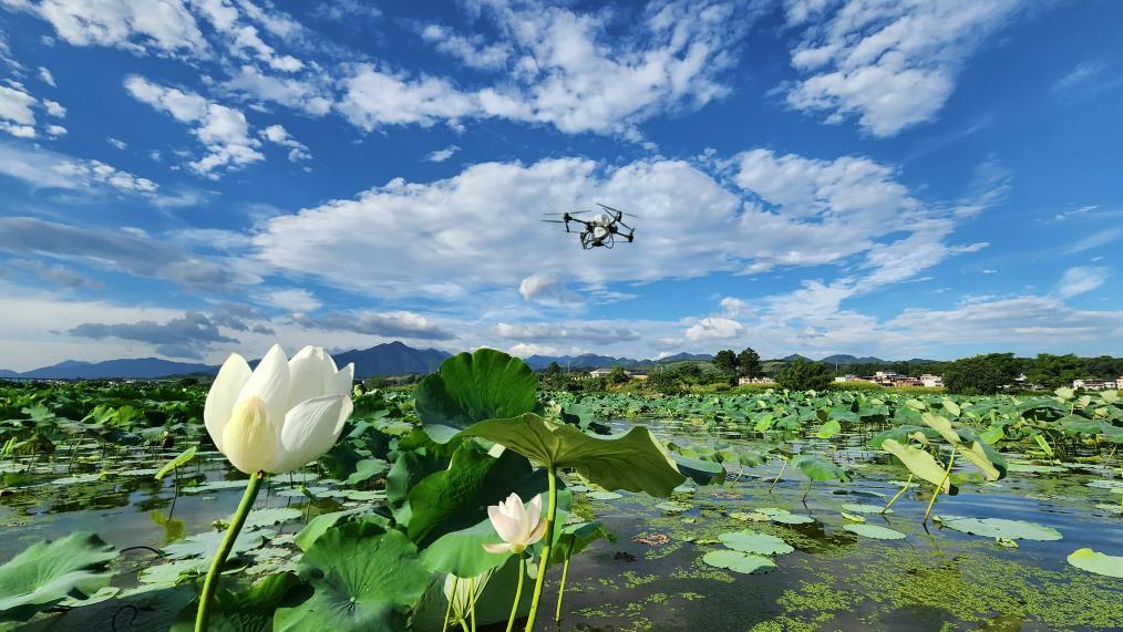 ↑2023年7月5日,植保无人机在湖南省常宁市板桥镇莲藕种植基地进行飞防作业,为全年丰产丰收夯实基础。新华社发(周秀鱼春摄)