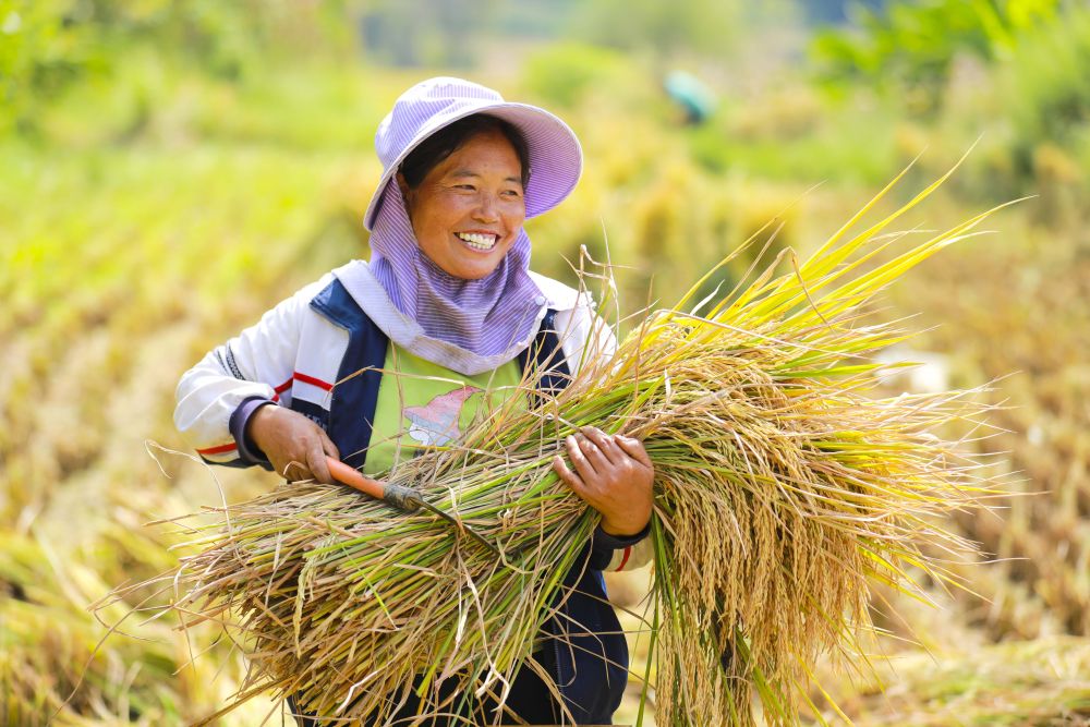 ↑2023年9月19日,在贵州省黔西市雨朵镇“稻鱼共生”的稻田里,农户在收割稻谷。新华社发(周训超摄)