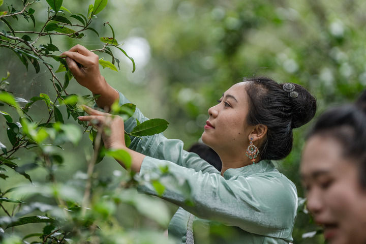 ↑2023年9月14日,在云南景迈山大平掌古茶林,傣族姑娘月怕仙在采摘茶叶。景迈山走出了一条“以茶促旅、以旅带茶、茶旅互融”的乡村振兴之路。新华社记者 胡超 摄