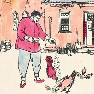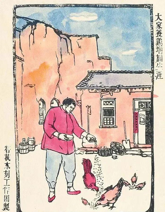 鲁艺木刻工作团制作的新年画《大家养鸡增加生产》。新华社发(延安鲁艺文化中心供图)