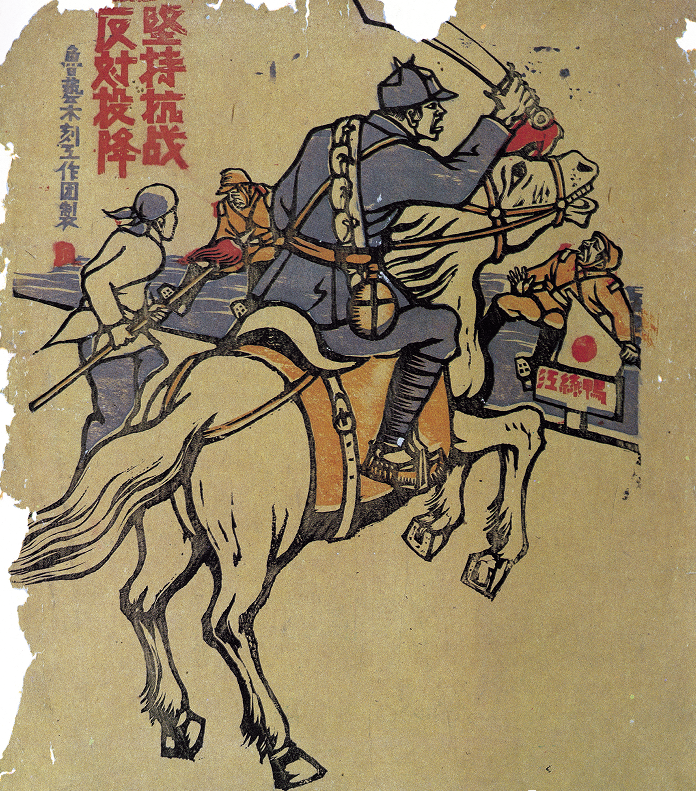 鲁艺木刻工作团制作的新年画《坚持抗战 反对投降》。新华社发(延安鲁艺文化中心供图)