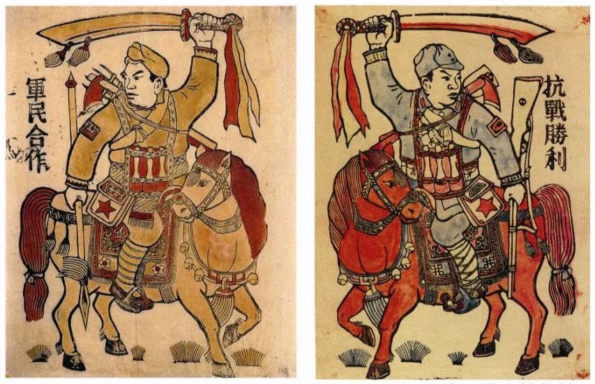 鲁艺木刻工作团制作的新年画《军民合作》和《抗战胜利》。新华社发(延安鲁艺文化中心供图)