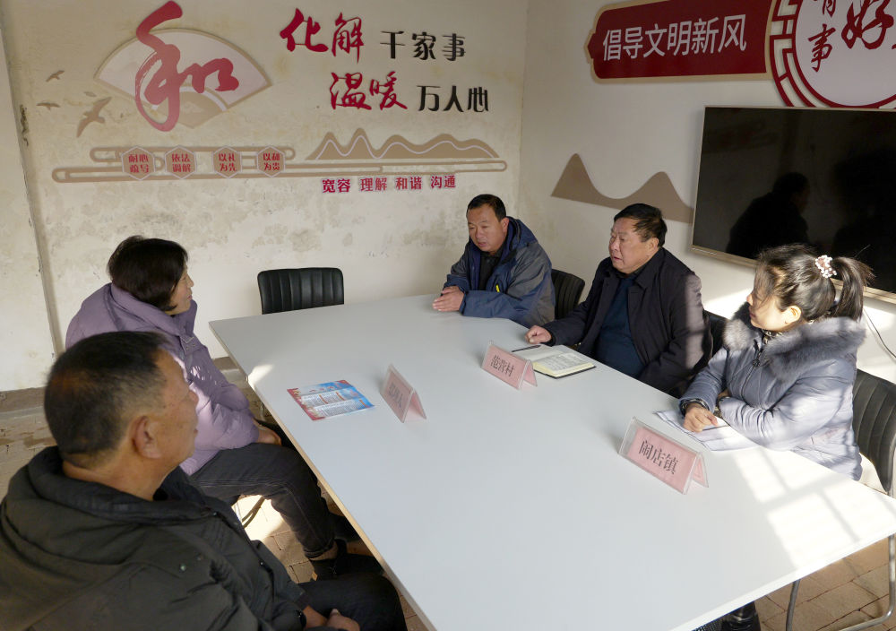 在宝丰县闹店镇范营村“摆理堂”,村镇干部(右)为村民进行信访调解(2023年12月20日摄)。河南省宝丰县积极推进四下基层工作深入开展,已打造闹店镇范营村“摆理堂”、石桥镇东大庄村“老娘舅茶室”等系列乡村社区服务阵地,协调邻里关系,有效化解各类矛盾,同时不断丰富工作内容,拓展服务功能,助力乡村振兴。新华社记者 李嘉南 摄