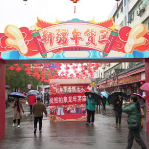 淅淅沥沥的冬雨冲洗着武汉东西湖区柏泉古镇的街道,作为当地的春节习俗,茅庙集庙会2月1日至3日举办。除了传统的武汉本地腊肉、炸肉圆等,今年庙会上最火爆的是来自新疆的年货。
