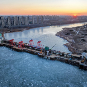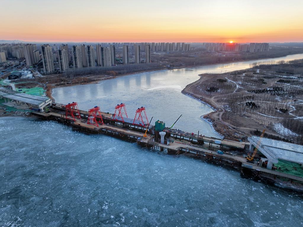 冬日,潮白河结冰的河面上,厂通路潮白河大桥项目正在争分夺秒加紧施工。站在施工搭起的栈桥上眺望,河岸两侧的引桥已初具规模,向远处延伸。向东,是廊坊大厂回族自治县已经通车的厂通路;向西,则是通向北京城市副中心的通怀路。