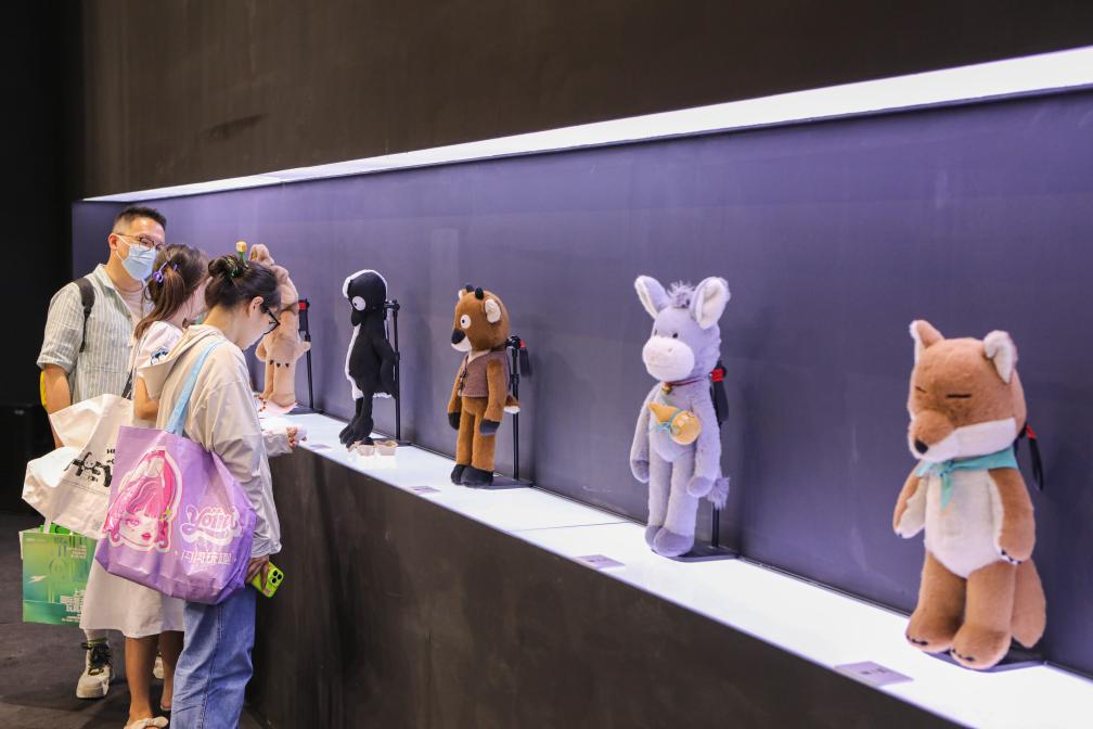↑9月30日,参观者在2023 PTS上海国际潮流玩具展“问童子”展位参观。
