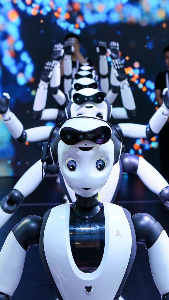 ↑7月7日,在2023世界人工智能大会上人形机器人进行“千手观音”表演。
