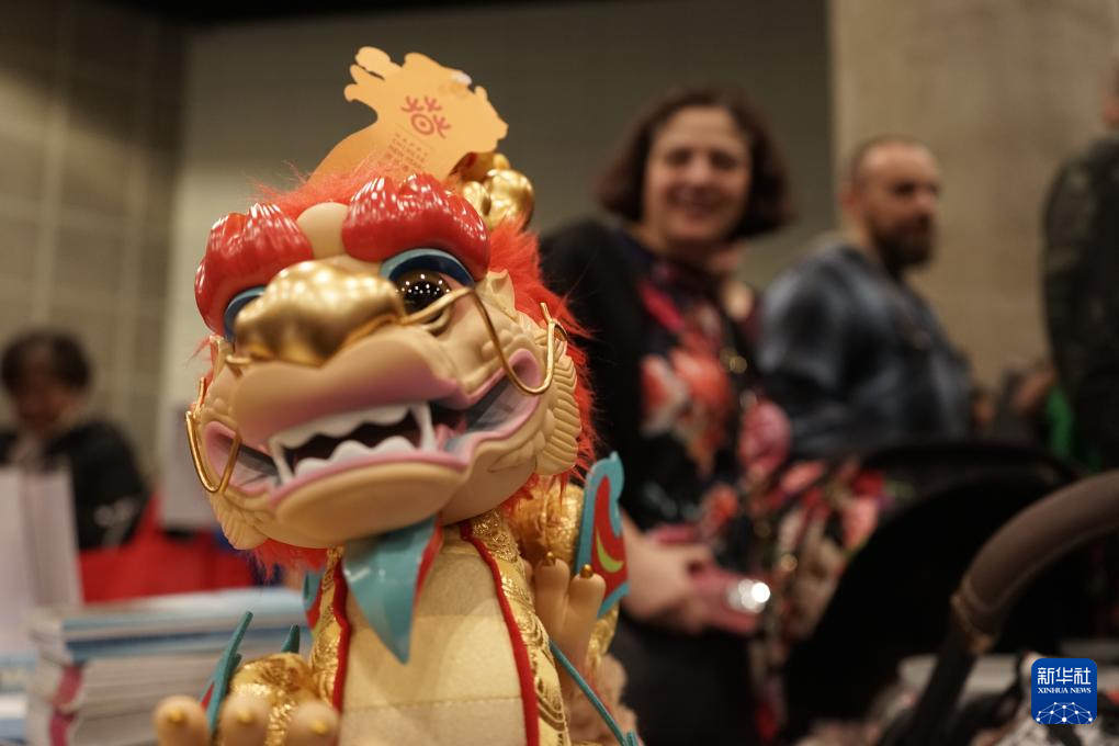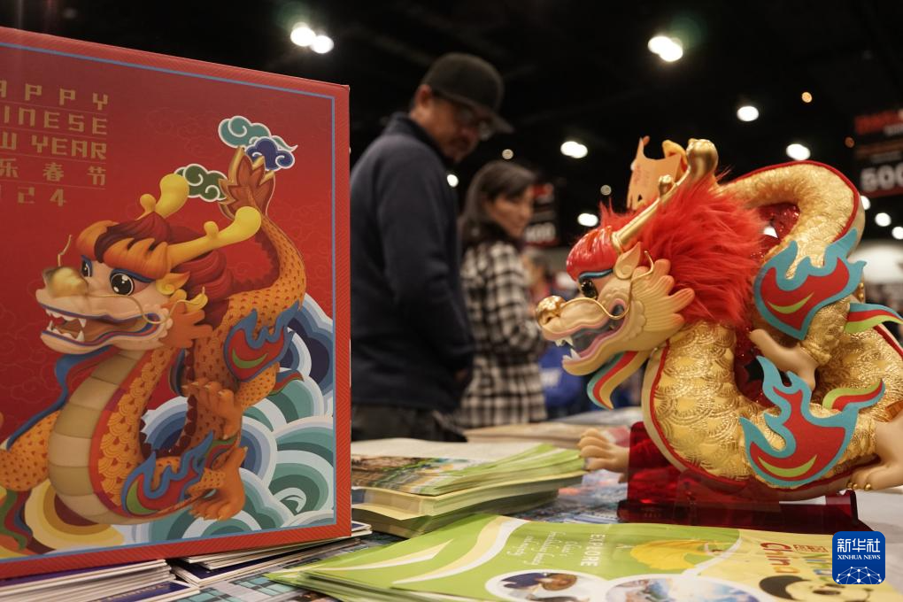 这是2月3日在美国洛杉矶举行的2024年洛杉矶旅游探险展中国旅游展位上拍摄的“欢乐春节”吉祥物“吉祥龙”。新华社发(曾慧摄)