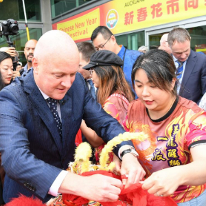 2月3日,新西兰总理拉克森(前左)参加在奥克兰举行的“新春花市同乐日”活动,与数千名当地华人共迎龙年新春。这是拉克森去年11月就任总理以来首次参加当地华人社区大型活动。新华社记者 郭磊 摄